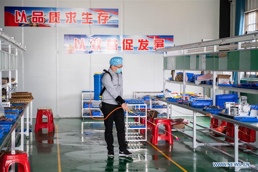 A worker disinfects a poverty alleviation workshop in Taoyuan County, central China's Hunan Province, Feb. 20, 2020. After taking sufficient measures of preventing the novel coronavirus, many production lines of the poverty alleviation workshop have resumed production. (Photo by Chen Sihan/Xinhua)