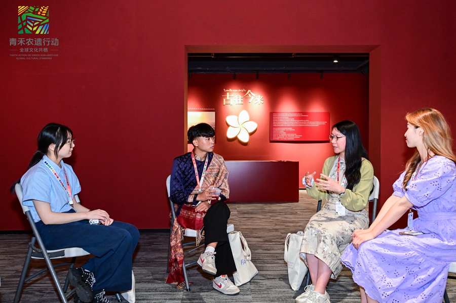 Youth representatives of the Youth Action on Green Agri-Heritage have group discussions on agricultural heritage protection, digital agriculture, and green trade during their visit to the Laos Economic and Trade Cooperation Expo.