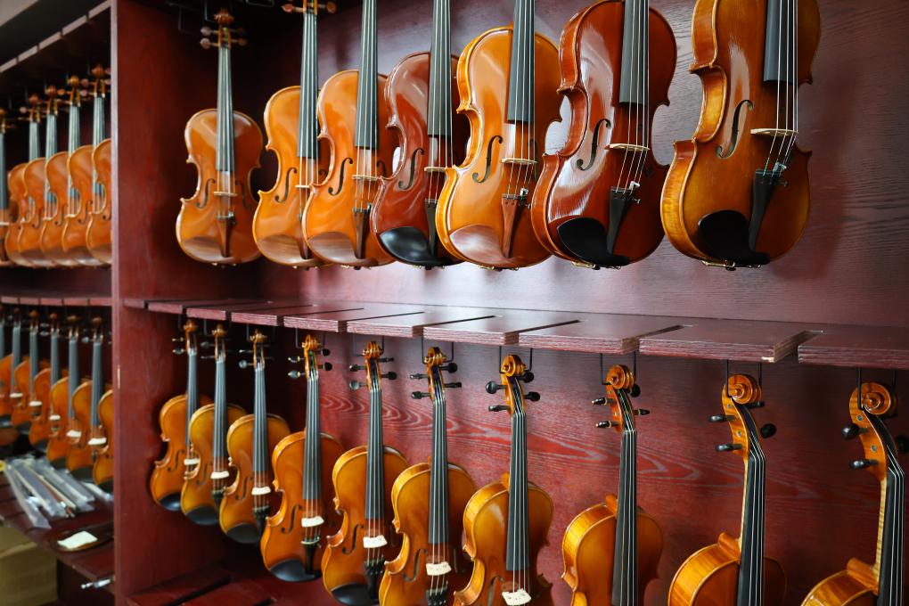 This photo taken on July 24, 2025 shows musical instruments on display at an enterprise in Queshan Violin Industrial Park, Queshan County of Zhumadian City, central China's Henan Province. (Xinhua/Zhu Weixi)