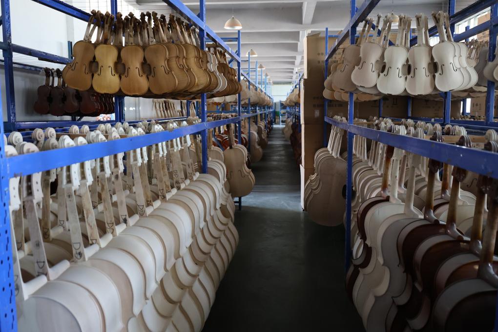 This photo taken on July 24, 2025 shows semi-finished musical instruments at an enterprise in Queshan Violin Industrial Park, Queshan County of Zhumadian City, central China's Henan Province. (Xinhua/Zhu Weixi)