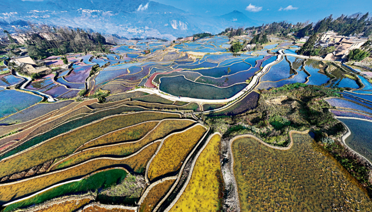 In the terraced fields in Honghe Hani and Yi Autonomous Prefecture, Yunnan Province, southwest China’s Yunnan Province, the morning mist drifts up from the valleys while the tiered ridges spread like the fingerprints of the earth.