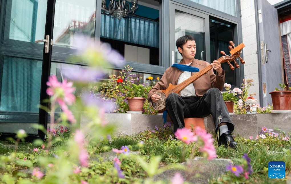 Padruk Tendar plays Zhanian, a traditional Tibetan stringed instrument, at home in Lhasa, southwest China's Xizang Autonomous Region, Sept. 11, 2025. Padruk Tendar has been deeply influenced by traditional Tibetan arts since childhood, including opera and Thangka paintings. Drawing color inspiration from murals and Thangka, he utilizes modern fabrics to reinvigorate Tibetan aesthetics, imbuing the garments with both classical charm and contemporary style. His designs have not only appeared at festive celebrations in Xizang but have also been showcased on international cultural stages. (Xinhua/Tenzin Nyida)