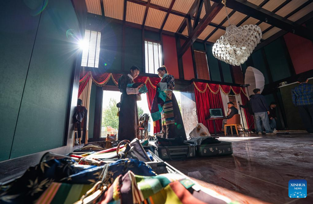 Padruk Tendar (1st L) discusses with a model on Tibetan costume fabric in Lhasa, southwest China's Xizang Autonomous Region, Sept. 9, 2025. (Xinhua/Tenzin Nyida)