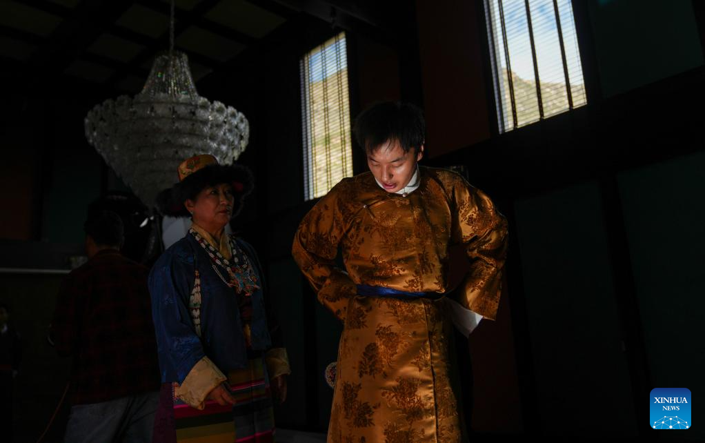 Padruk Tendar (R) puts on costumes designed by himself in Lhasa, southwest China's Xizang Autonomous Region, Sept. 9, 2025. (Xinhua/Jigme Dorje)