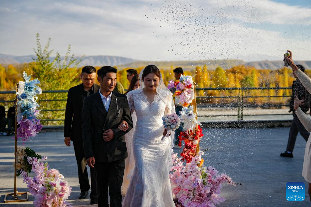 The newlyweds Kumusi Yesdawulti and Bukehan Yelszi attend an outdoor wedding at a forest park in Tekes County, northwest China's Xinjiang Uygur Autonomous Region, Oct. 11, 2025.(Xinhua/Xu Hongyan)