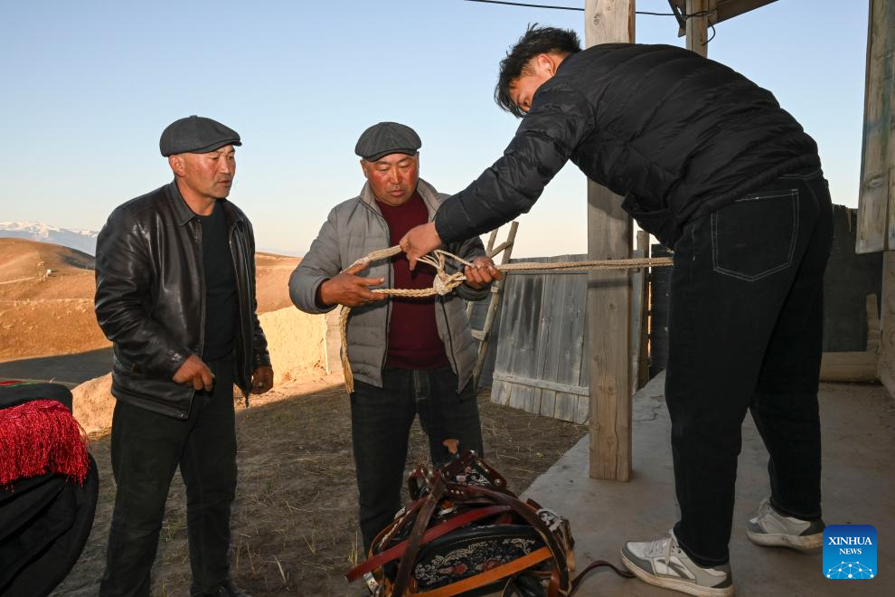 Father of the bride Kumusi Yesdawulti (L) and his relatives prepare saddlery in Karadala Township of Tekes County, northwest China's Xinjiang Uygur Autonomous Region, Oct. 11, 2025.(Xinhua/Hu Huhu)