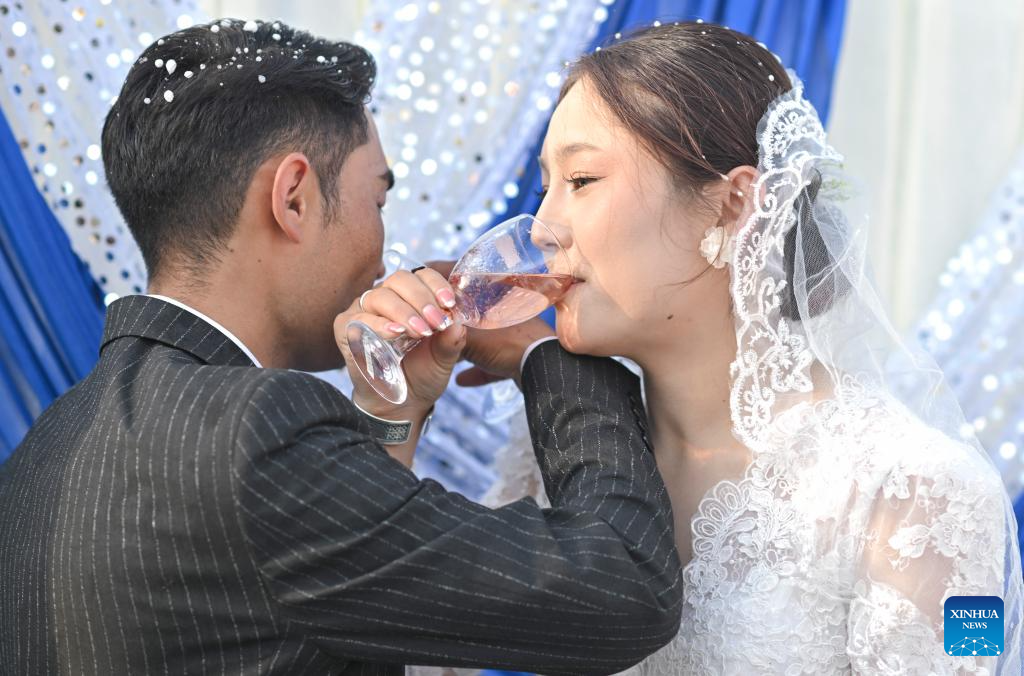 The newlyweds Kumusi Yesdawulti and Bukehan Yelszi have wine during an outdoor wedding at a forest park in Tekes County, northwest China's Xinjiang Uygur Autonomous Region, Oct. 11, 2025.(Xinhua/Hu Huhu)
