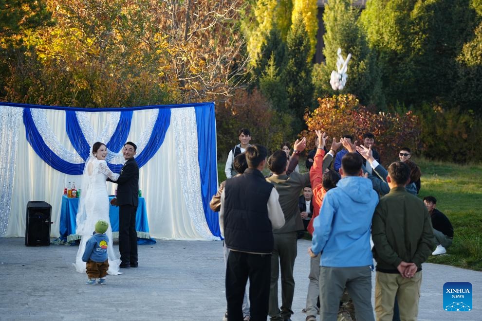 The newlyweds Kumusi Yesdawulti and Bukehan Yelszi attend an outdoor wedding at a forest park in Tekes County, northwest China's Xinjiang Uygur Autonomous Region, Oct. 11, 2025.(Xinhua/Xu Hongyan)