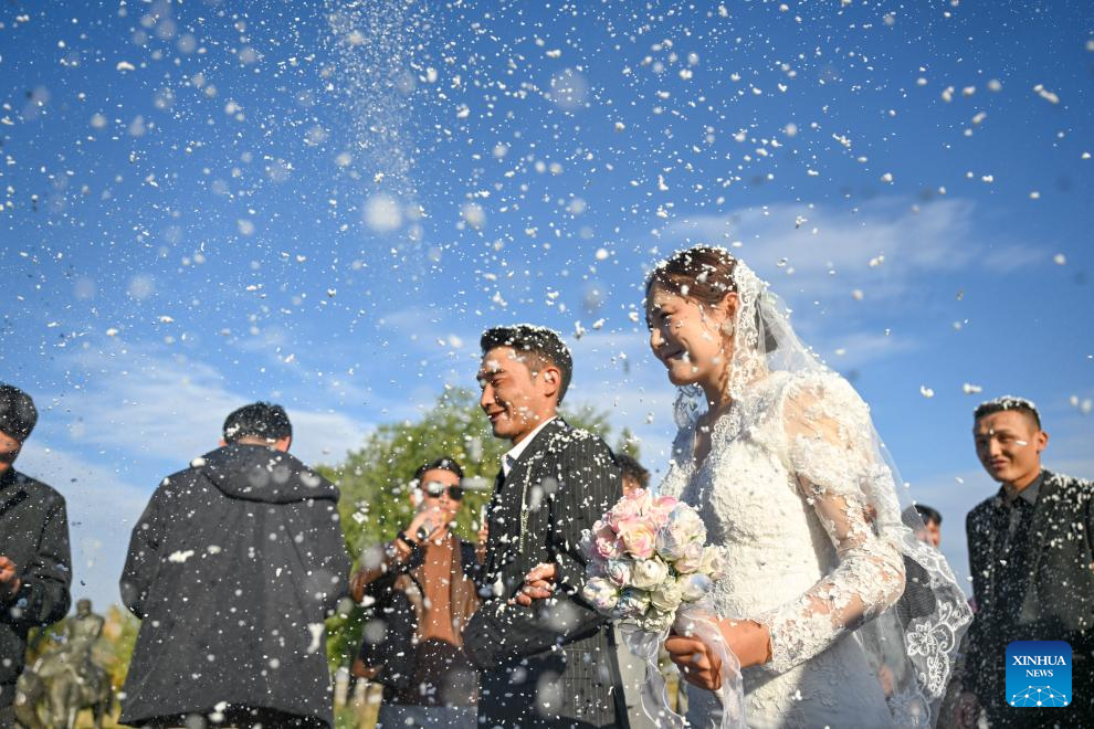 The newlyweds Kumusi Yesdawulti and Bukehan Yelszi walk hand in hand during an outdoor wedding at a forest park in Tekes County, northwest China's Xinjiang Uygur Autonomous Region, Oct. 11, 2025.(Xinhua/Hu Huhu)