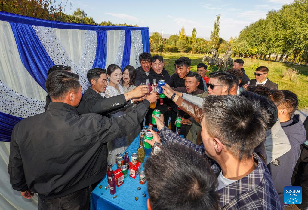 The newlyweds Kumusi Yesdawulti and Bukehan Yelszi celebrate with their relatives and friends at a forest park in Tekes County, northwest China's Xinjiang Uygur Autonomous Region, Oct. 11, 2025. (Xinhua/Xu Hongyan)