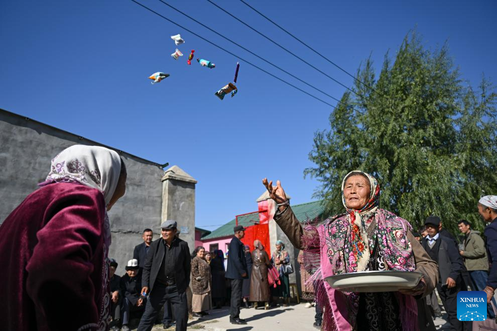 Villagers welcome Kumusi Yesdawulti, the bride in a wedding procession, at the groom Bukehan Yelszi's home in Karadala Township of Tekes County, northwest China's Xinjiang Uygur Autonomous Region, Oct. 11, 2025.(Xinhua/Hu Huhu)