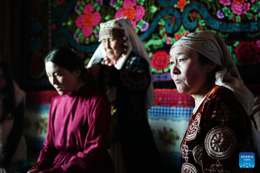 Mother of the bride Kumusi Yesdawulti (1st R) sheds tears to see her daughter off in Karadala Township of Tekes County, northwest China's Xinjiang Uygur Autonomous Region, Oct. 11, 2025.(Xinhua/Xu Hongyan)