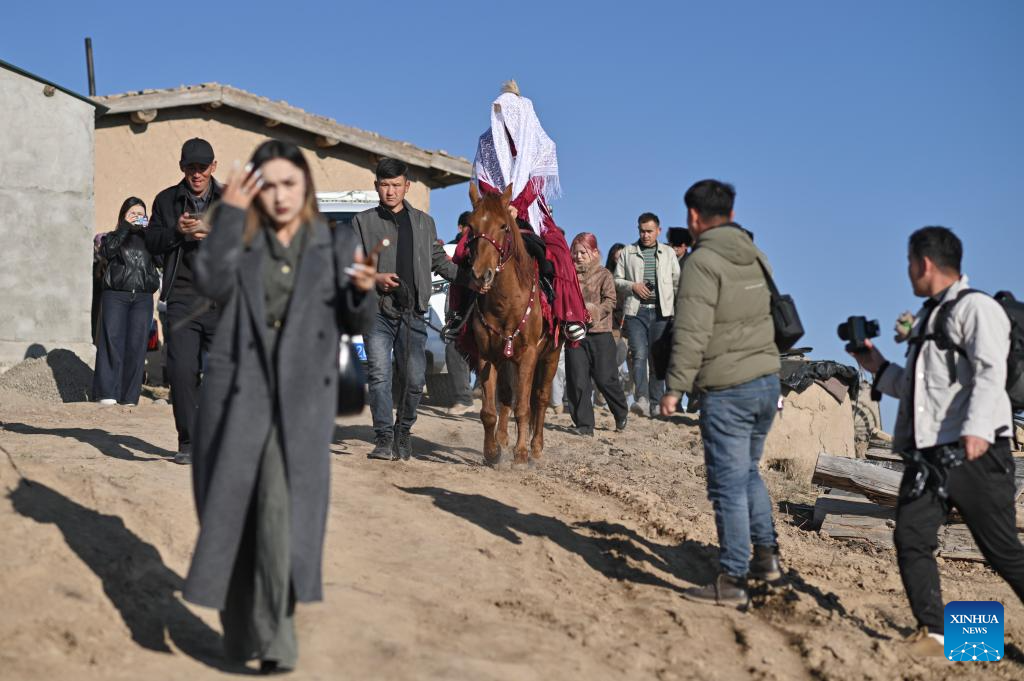 Kumusi Yesdawulti, the bride, rides a horse heading to a wedding procession in Karadala Township of Tekes County, northwest China's Xinjiang Uygur Autonomous Region, Oct. 11, 2025.(Xinhua/Hu Huhu)