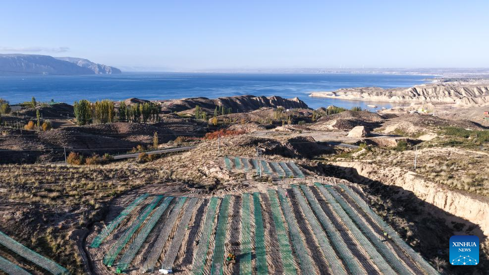 An aerial drone photo taken on Oct. 18, 2025 shows fish drying nets in the Longyang Gorge area in Gonghe County of Hainan Tibetan Autonomous Prefecture, northwest China's Qinghai Province. Each year from late August to late November, fishermen in Longyang Gorge are busy harvesting silver fish.