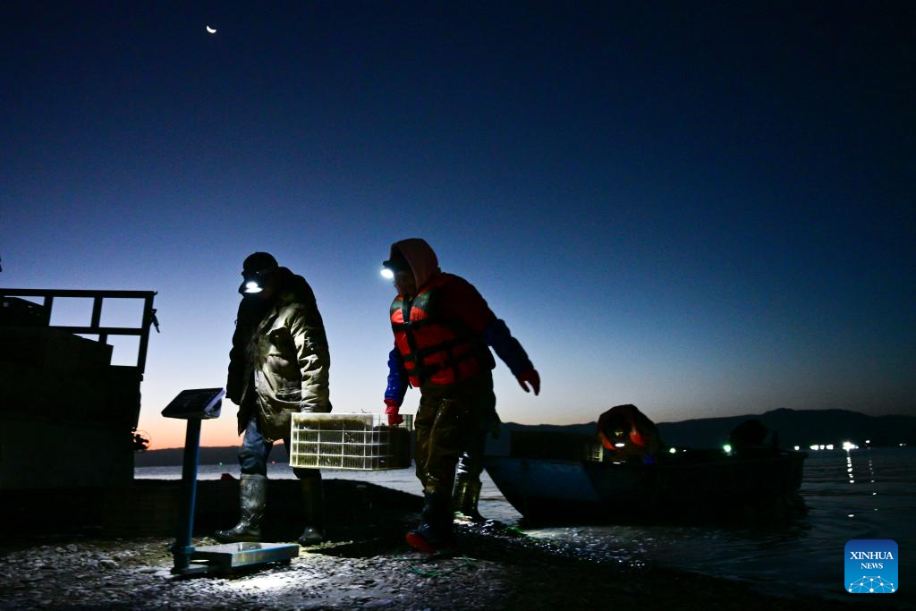 Fishermen weigh newly-harvested silver fish in the Longyang Gorge area in Gonghe County of Hainan Tibetan Autonomous Prefecture, northwest China's Qinghai Province, Oct. 18, 2025. Each year from late August to late November, fishermen in Longyang Gorge are busy harvesting silver fish.