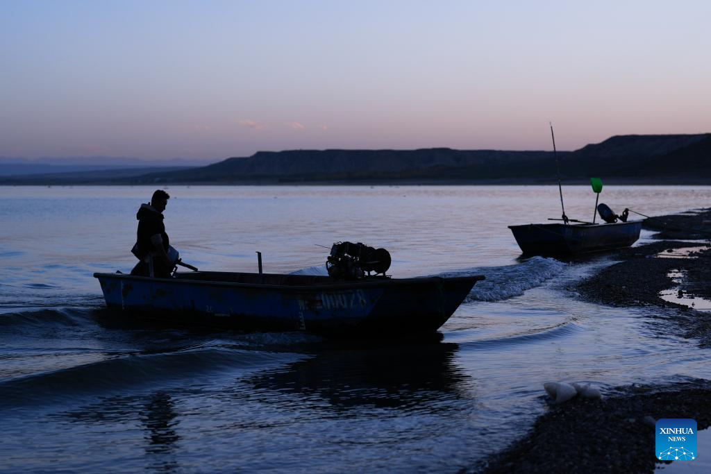 A fisherman docks a boat in the Longyang Gorge area in Gonghe County of Hainan Tibetan Autonomous Prefecture, northwest China's Qinghai Province, Oct. 17, 2025. Each year from late August to late November, fishermen in Longyang Gorge are busy harvesting silver fish.