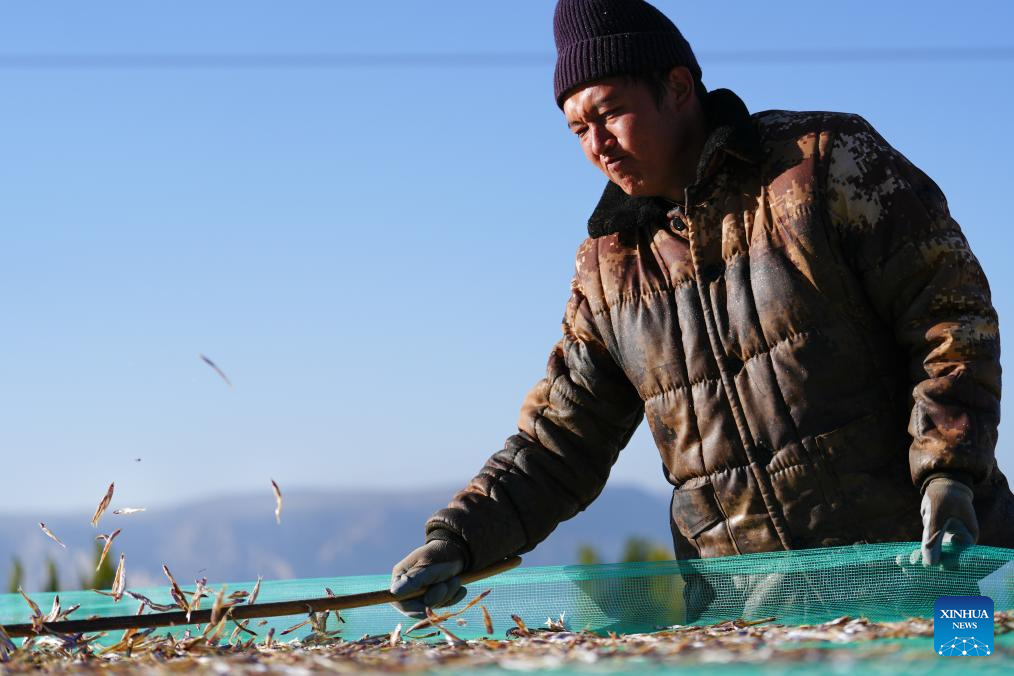 A worker processes dried silver fish in the Longyang Gorge area in Gonghe County of Hainan Tibetan Autonomous Prefecture, northwest China's Qinghai Province, Oct. 18, 2025. Each year from late August to late November, fishermen in Longyang Gorge are busy harvesting silver fish.
