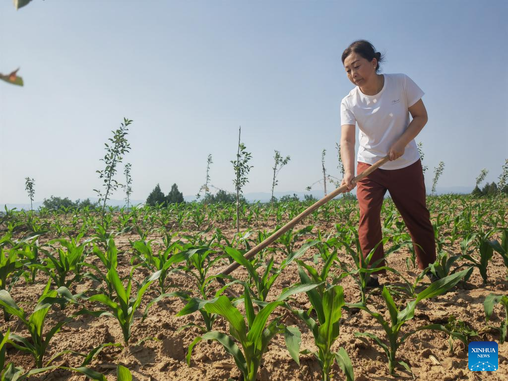 Wang Meimei works at a corn field in Guozhai Village of Yijun County, Tongchuan City of northwest China's Shaanxi Province, June 12, 2025. (Xinhua/Sun Zhenghao)