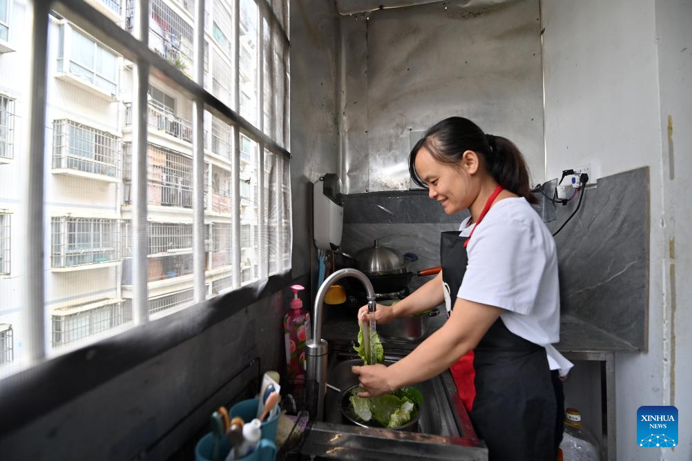 Lan Yezhen prepares vegetables for a meal at her home in Fengshan County, south China's Guangxi Zhuang Autonomous Region, Oct. 14, 2025.(Xinhua/Lu Boan)