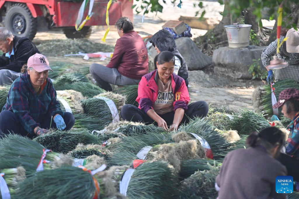 Villagers sort harvested chives in Jueshan Village of Sandu Town in Liuzhou City, south China's Guangxi Zhuang Autonomous Region, Oct. 28, 2025. Sandu Town has in recent years promoted the standardized and industrialized production of chives, and developed an integrated business system that ranges from planting and processing to sales and service.