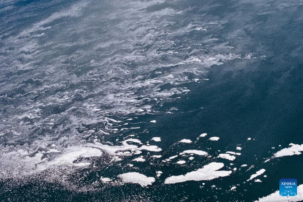 An aerial drone photo taken on Nov. 16, 2025 shows the frozen surface of the Dasugan Lake in Kazak Autonomous County of Aksay, Jiuquan, northwest China's Gansu Province. Dasugan Lake and Xiaosugan Lake are connected and are both formed by the meltwater from the Qilian Mountains. A unique phenomenon is that the upstream Xiaosugan Lake is a freshwater lake, while the downstream Dasugan Lake is a saline lake.