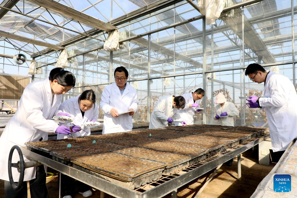 Ma Fengwang, a professor at the College of Horticulture of Northwest A&F University (NWAFU), conducts an apple variety breeding experiment with his team members in Yangling, northwest China's Shaanxi Province, Feb. 26, 2025. (Xinhua)