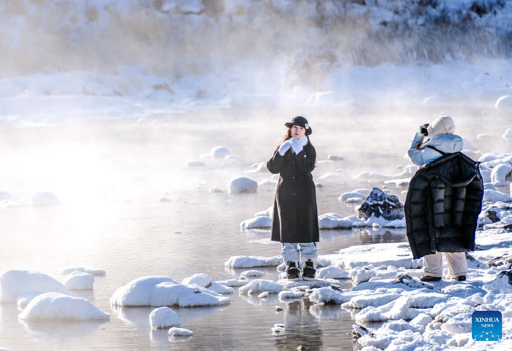 A tourist poses for a photo by the Halha River in the city of Arxan of Hinggan League, north China's Inner Mongolia Autonomous Region, Jan. 1, 2026. Despite Arxan's frigid winter cold, this geothermally-affected section of the Halha River never freezes, which attracts great amount of tourists in winter. (Xinhua/Ma Jinrui)