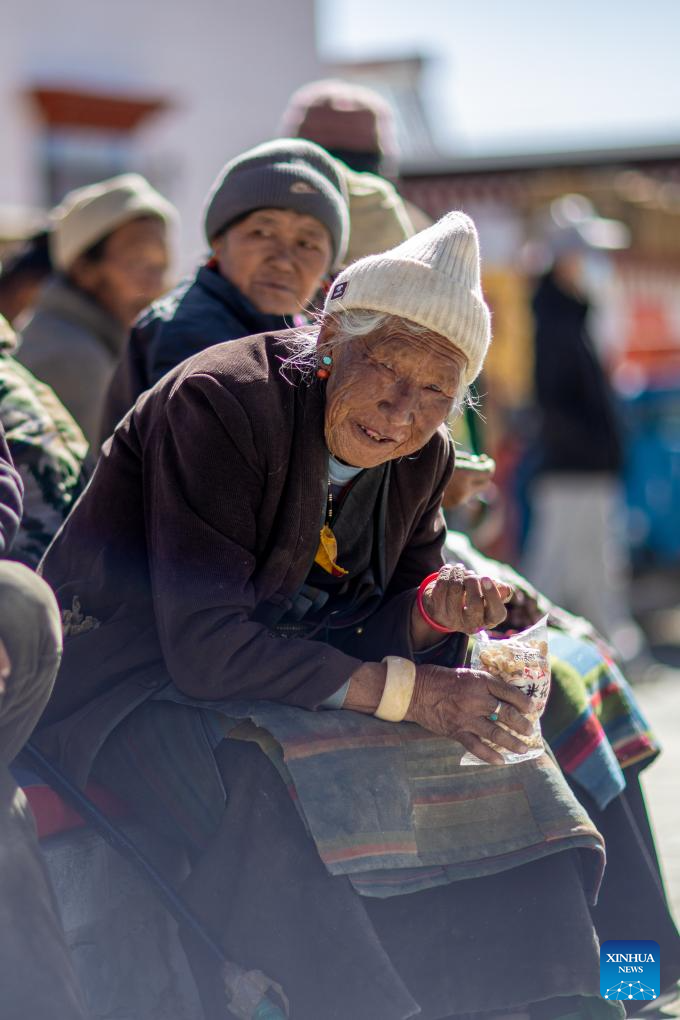 The elders bask in the sun at a square in Zimgag Village of Chamco Township, in Dingri County of Xigaze City, southwest China's Xizang Autonomous Region, on Jan. 5, 2026. In January 2025, a 6.8-magnitude earthquake struck Dingri County in the city of Xigaze, leveling thousands of houses.
