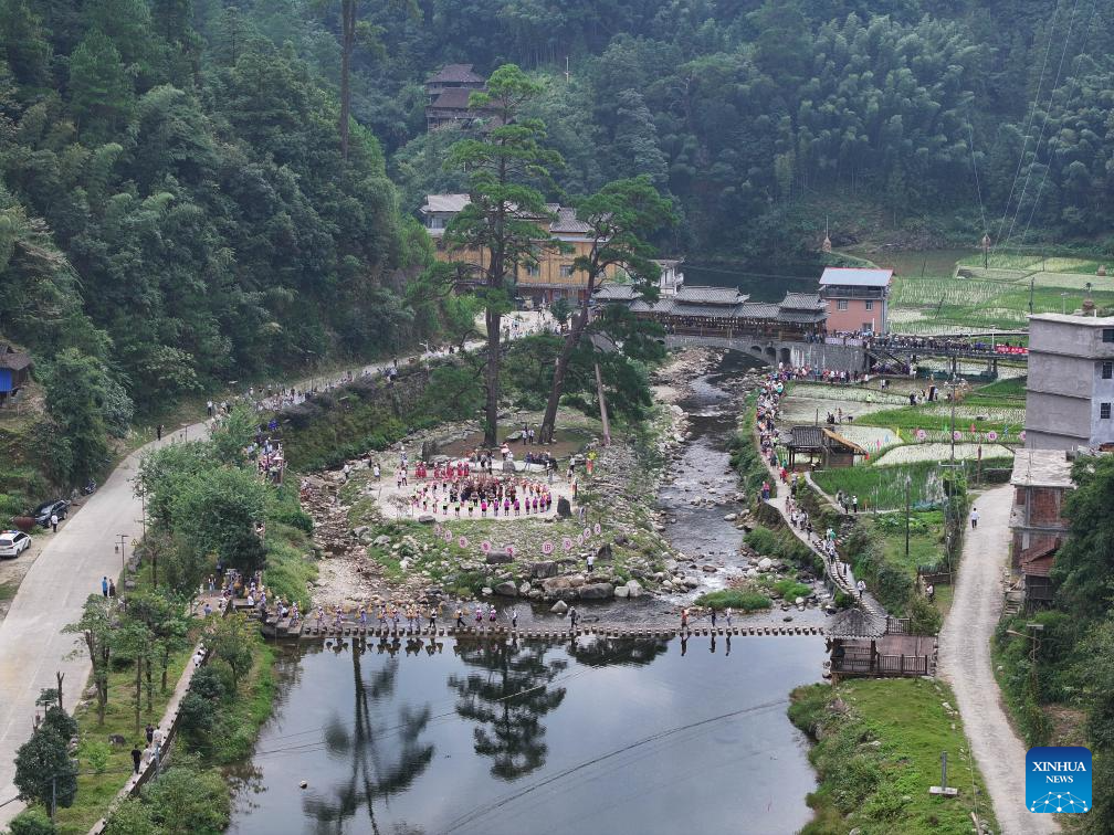 An aerial drone photo shows villagers celebrating harvest beside a river in Peixiu Village of Rongshui Miao Autonomous County, south China's Guangxi Zhuang Autonomous Region, Oct. 18, 2025. In Guangxi, many villages are nestled among mountains and bordered by rivers. People living there are accustomed to living by the water and coexisting with it. For thousands of years, ceaselessly flowing streams through the villages have nourished local culture and witnessed the development and changes in rural areas. (Xinhua/Huang Xiaobang)