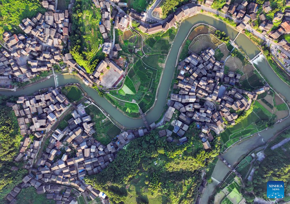 An aerial drone photo taken on July 7, 2024 shows a river in Pingyan Village of Linxi Town in Sanjiang Dong Autonomous County, south China's Guangxi Zhuang Autonomous Region. In Guangxi, many villages are nestled among mountains and bordered by rivers. People living there are accustomed to living by the water and coexisting with it. For thousands of years, ceaselessly flowing streams through the villages have nourished local culture and witnessed the development and changes in rural areas. (Xinhua/Huang Xiaobang)