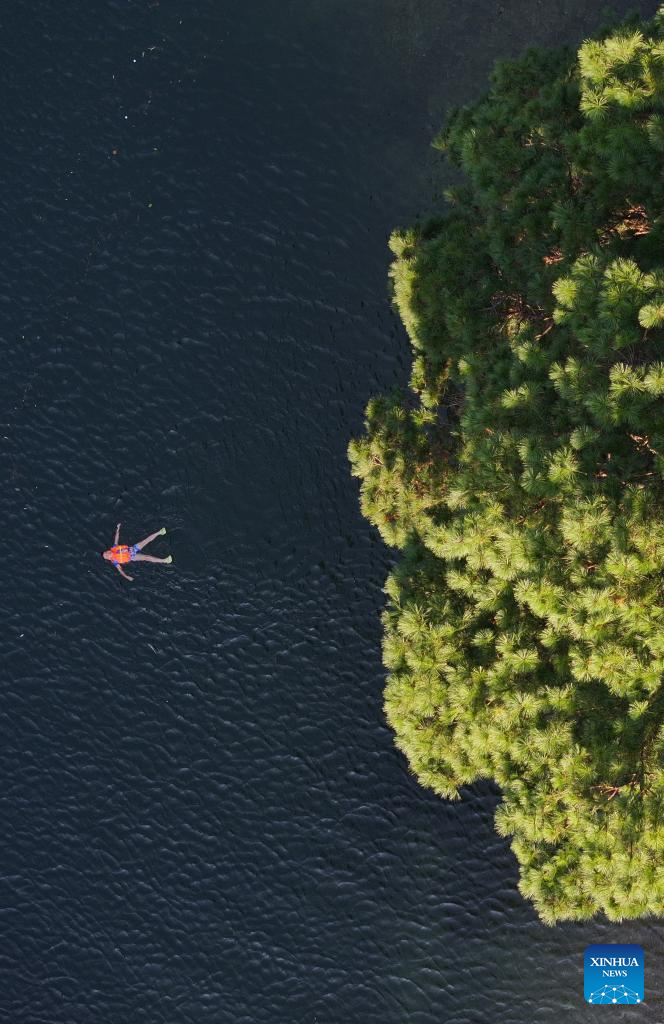 An aerial drone photo taken on Oct. 4, 2025 shows a tourist swimming in a river in Yuanbao Village of Antai Township, Rongshui Miao Autonomous County, south China's Guangxi Zhuang Autonomous Region. In Guangxi, many villages are nestled among mountains and bordered by rivers. People living there are accustomed to living by the water and coexisting with it. For thousands of years, ceaselessly flowing streams through the villages have nourished local culture and witnessed the development and changes in rural areas. (Xinhua/Huang Xiaobang)