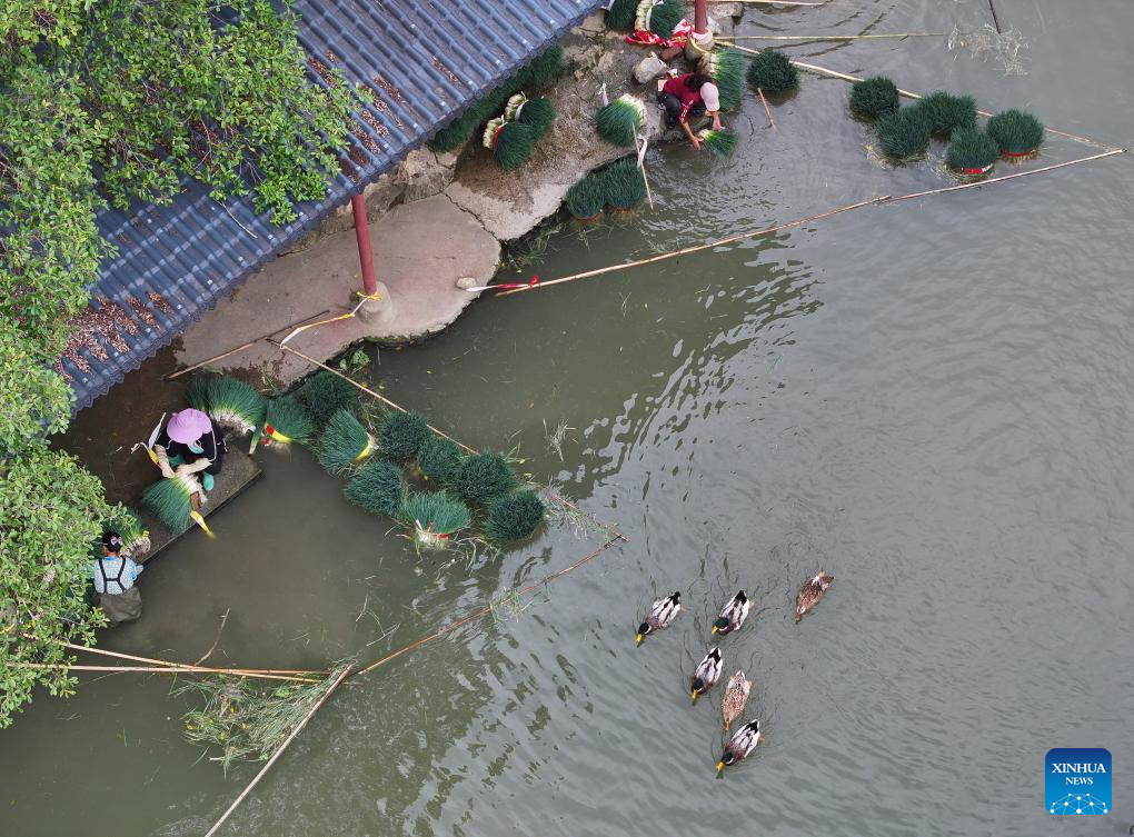 An aerial drone photo taken on July 10, 2025 shows villagers and tourists catching fish during a festival in Liangshuang Village of Hongshui Township, Rongshui Miao Autonomous County, south China's Guangxi Zhuang Autonomous Region. In Guangxi, many villages are nestled among mountains and bordered by rivers. People living there are accustomed to living by the water and coexisting with it. For thousands of years, ceaselessly flowing streams through the villages have nourished local culture and witnessed the development and changes in rural areas. (Xinhua/Huang Xiaobang)