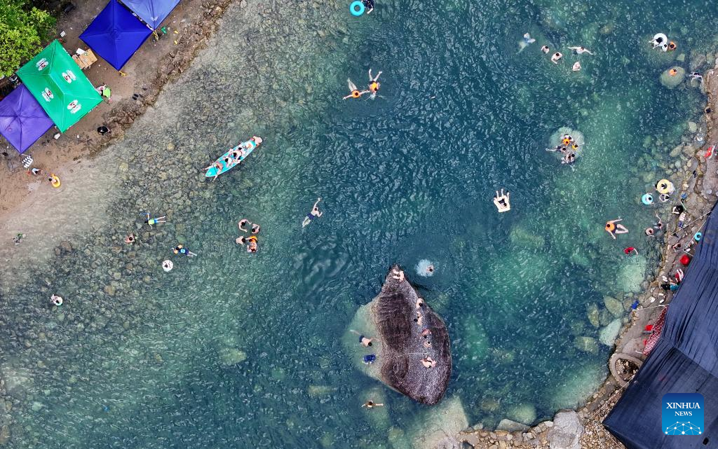 An aerial drone photo taken on July 19, 2025 shows tourists cooling off in a river in Yubu Village of Xiangfen Township, Rongshui Miao Autonomous County, south China's Guangxi Zhuang Autonomous Region. In Guangxi, many villages are nestled among mountains and bordered by rivers. People living there are accustomed to living by the water and coexisting with it. For thousands of years, ceaselessly flowing streams through the villages have nourished local culture and witnessed the development and changes in rural areas. (Xinhua/Huang Xiaobang)