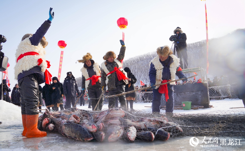 Fishermen catch fish at the opening ceremony of the 11th Jingpo Lake Winter Fishing Festival and the first Jingpo Lake Ice Fishing Challenge in Mudanjiang, northeast China's Heilongjiang Province, Jan. 15, 2026. (People's Daily Online/Su Jinggang)
