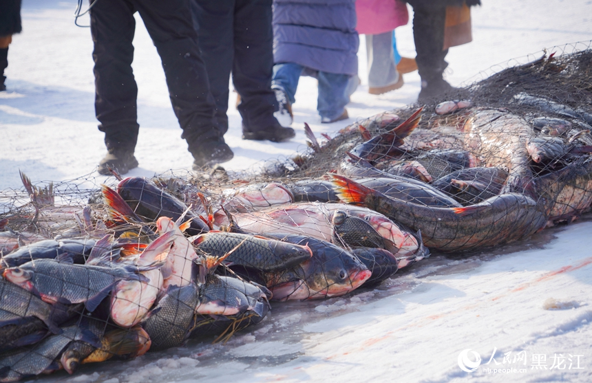 Photo shows fish caught at the opening ceremony of the 11th Jingpo Lake Winter Fishing Festival and the first Jingpo Lake Ice Fishing Challenge in Mudanjiang, northeast China's Heilongjiang Province, Jan. 15, 2026. (People's Daily Online/Su Jinggang)