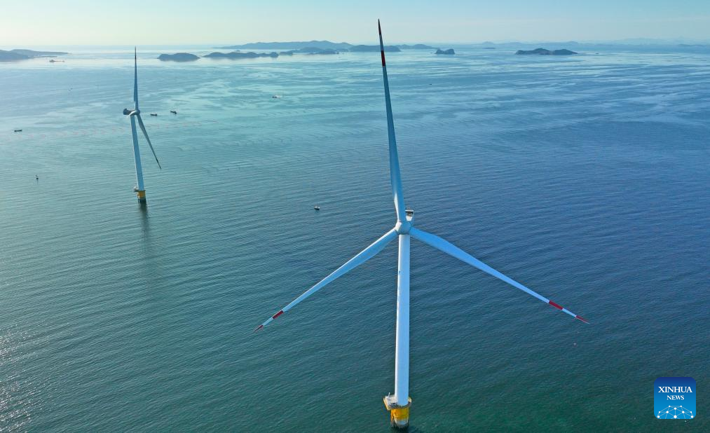 An aerial drone photo taken on Sept. 13, 2023 shows offshore wind turbines in the waters of Zhuanghe City, northeast China's Liaoning Province. (Xinhua/Yang Qing)