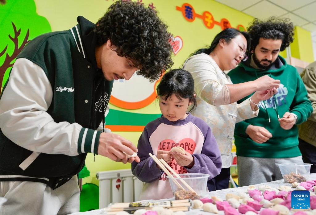 International students of North Minzu University make dumplings together with local residents in Yinchuan, northwest China's Ningxia Hui Autonomous Region, Feb. 5, 2026. As the Spring Festival approaches, international students from North Minzu University were invited to a community in Yinchuan to experience traditional Chinese folk customs and share the festive joy of the Chinese New Year with local residents. (Xinhua/Yang Zhisen)