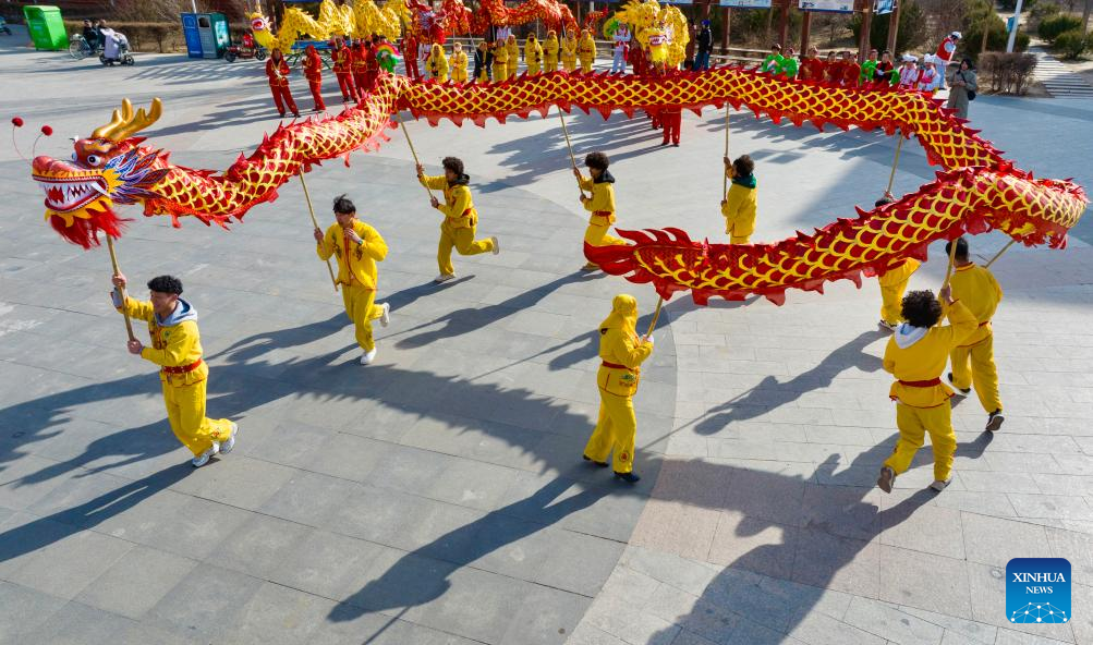 An aerial drone photo shows international students of North Minzu University experiencing dragon dance with local residents in Yinchuan, northwest China's Ningxia Hui Autonomous Region, Feb. 5, 2026. As the Spring Festival approaches, international students from North Minzu University were invited to a community in Yinchuan to experience traditional Chinese folk customs and share the festive joy of the Chinese New Year with local residents. (Xinhua/Yang Zhisen)