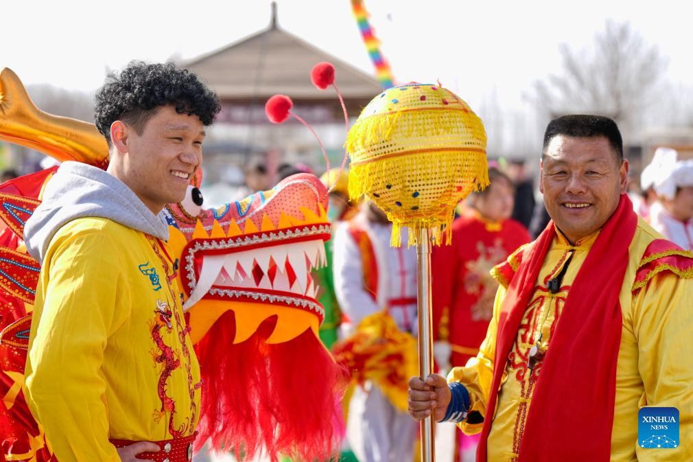 An international student (L) of North Minzu University exchanges experience dragon dance with local residents in Yinchuan, northwest China's Ningxia Hui Autonomous Region, Feb. 5, 2026. As the Spring Festival approaches, international students from North Minzu University were invited to a community in Yinchuan to experience traditional Chinese folk customs and share the festive joy of the Chinese New Year with local residents. (Xinhua/Yang Zhisen)