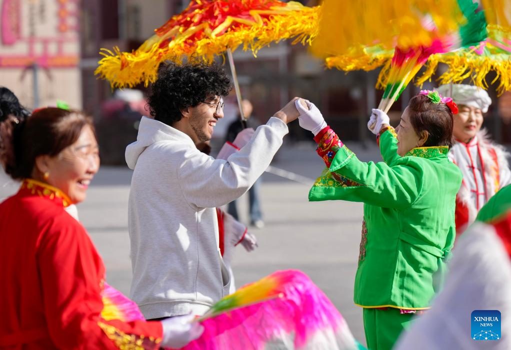 An international student of North Minzu University experiences Yangge dance with local residents in Yinchuan, northwest China's Ningxia Hui Autonomous Region, Feb. 5, 2026. As the Spring Festival approaches, international students from North Minzu University were invited to a community in Yinchuan to experience traditional Chinese folk customs and share the festive joy of the Chinese New Year with local residents. (Xinhua/Yang Zhisen)