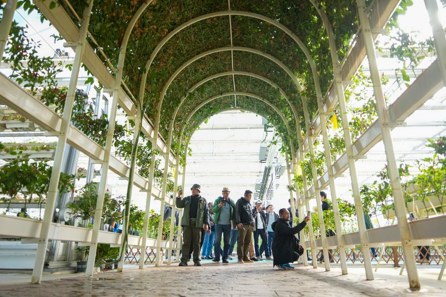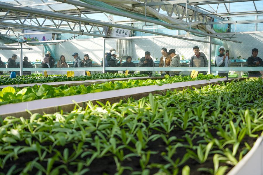 Members of the fifth session of the Indonesian Rural Cadre Training Program visit a tech-empowered agricultural park in Shouguang City, east China's Shandong Province, Nov. 2, 2025. (Xinhua/Xu Suhui)