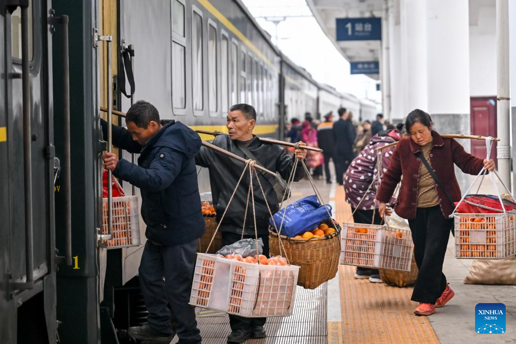 Farmers carrying goods for sale board the train No. 7272 at Jinhe Railway Station in central China's Hunan Province, Feb. 12, 2026. The train No. 7272/7271 has run across the mountainous areas in Hunan, Guizhou and Chongqing for almost 20 years. With an average speed of just 40 kilometers per hour, the train has made it easier for residents along the route to travel and commute, while also helping local products reach wider markets. (Photo by Yuan Fuhong/Xinhua)