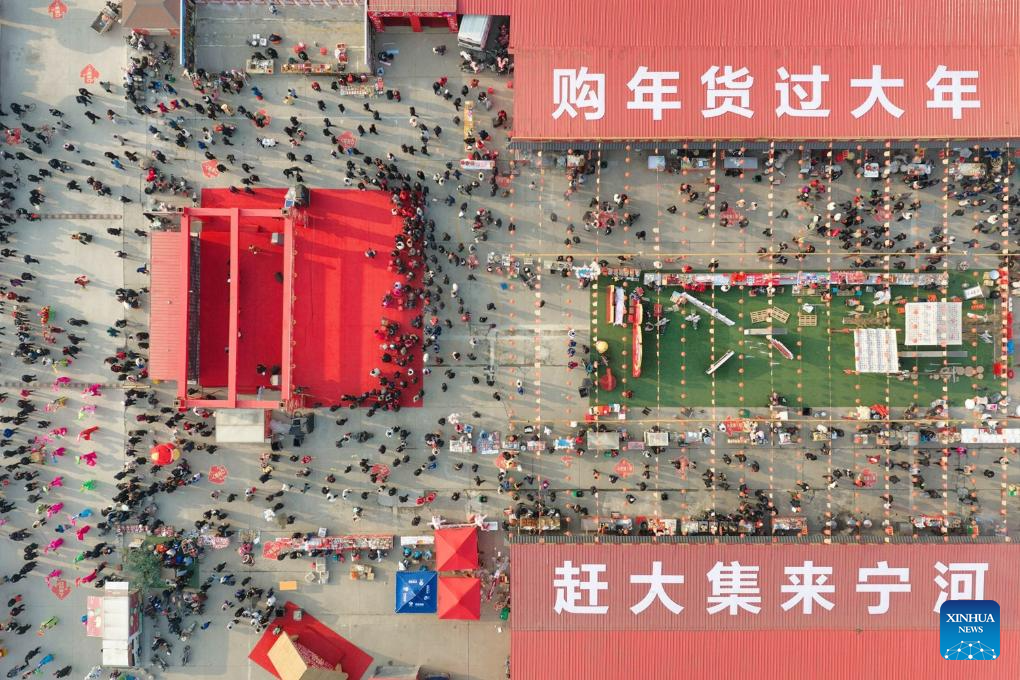This aerial drone photo shows people purchasing goods needed for the Chinese New Year celebrations at a market in north China's Tianjin, Feb. 10, 2026. Markets across the country are bustling nowadays as people flock there to stock up on goods in preparation for the upcoming Spring Festival, or the Chinese New Year. (Photo by Du Penghui/Xinhua)