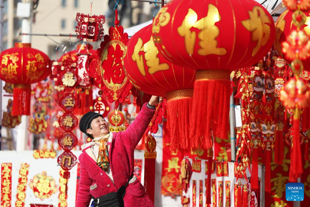 A shop owner arranges Chinese New Year decorations at a market in Tancheng County of Linyi City, east China's Shandong Province, Feb. 13, 2026. Markets across the country are bustling nowadays as people flock there to stock up on goods in preparation for the upcoming Spring Festival, or the Chinese New Year. (Photo by Zhang Chunlei/Xinhua)