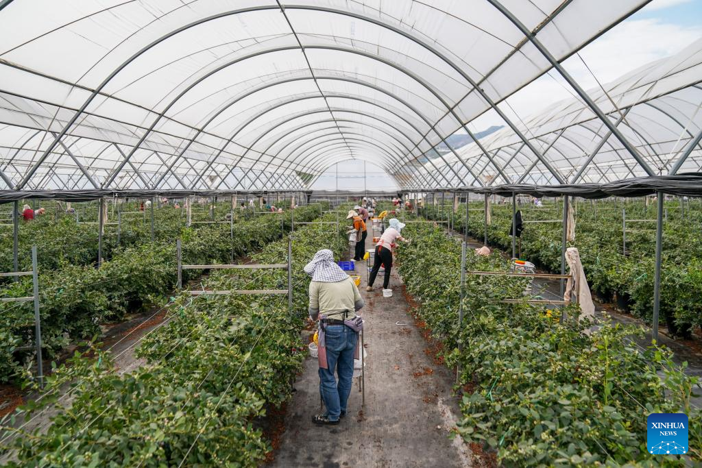 Farmers harvest blueberries at a greenhouse in Mengzi City of Honghe Hani and Yi Autonomous Prefecture, southwest China's Yunnan Province, Feb. 27, 2026. In recent years, the blueberry industry in Mengzi City is transforming from individual planting to scaled cultivation. To date, the city's blueberry cultivation area has reached 70,000 mu (about 4,666.67 hectares).