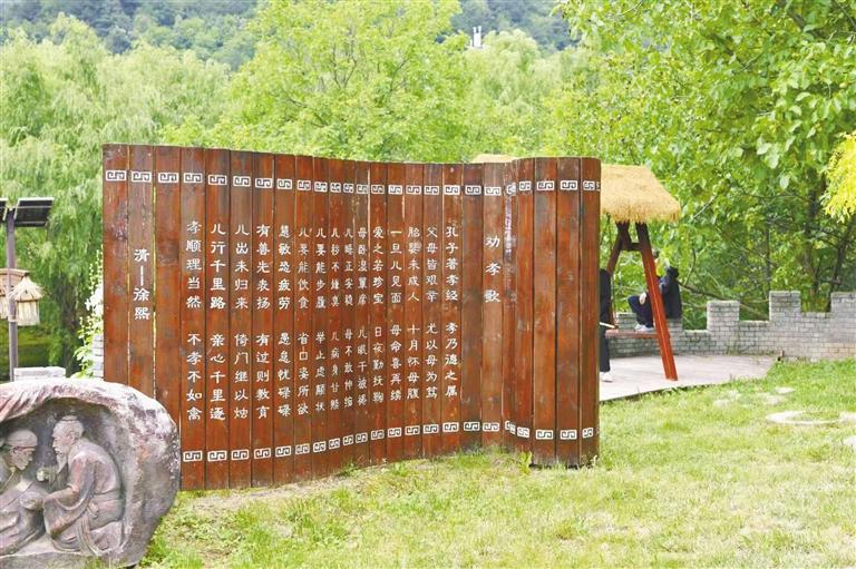 A view of a poem written by Xu Xi, a tribute student who was active during the late Qing Dynasty (1644 to 1912), known as “A Song Encouraging Filial Piety” painted on pieces of wood in Baiyun village, Jutou town, Taibai county, Shaanxi province. Meticulous efforts have been made to enhance the environment, highlight the artistry, and enable visitors to enjoy the idyllic pastoral lifestyle that exists in the hamlet in recent years. [Photo by Zhang Siyu / Shaanxi Daily]