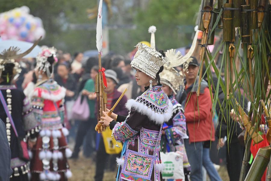 People attend a fair celebrating the "pohui" festival in Xiangfen Township of Rongshui Miao Autonomous County, Liuzhou City, south China's Guangxi Zhuang Autonomous Region, March 4, 2026. (Xinhua/Huang Xiaobang)