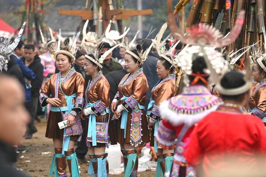 People attend a fair celebrating the "pohui" festival in Xiangfen Township of Rongshui Miao Autonomous County, Liuzhou City, south China's Guangxi Zhuang Autonomous Region, March 4, 2026. (Xinhua/Huang Xiaobang)