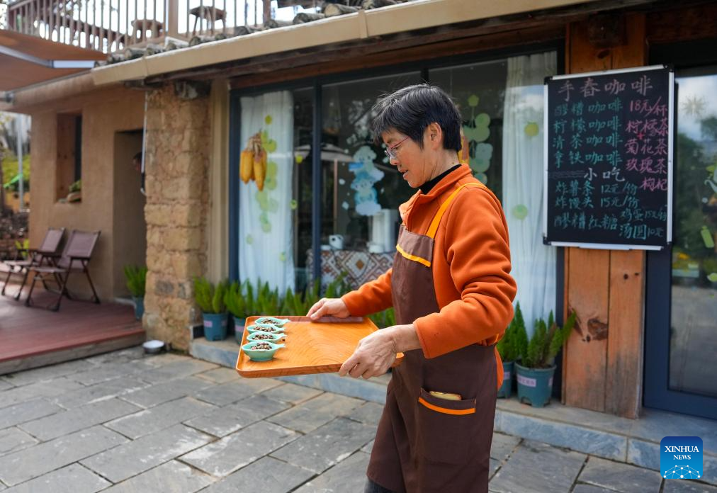 A sojourner from southwest China's Sichuan Province serves the tourists at the book cafe she runs in Manhai Village, Mojiang Hani Autonomous County of Pu'er City, southwest China's Yunnan Province, Dec. 20, 2025.(Xinhua/Chen Xinbo)