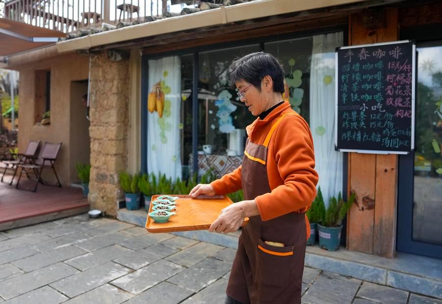 A sojourner from southwest China's Sichuan Province serves the tourists at the book cafe she runs in Manhai Village, Mojiang Hani Autonomous County of Pu'er City, southwest China's Yunnan Province, Dec. 20, 2025. (Xinhua/Chen Xinbo)